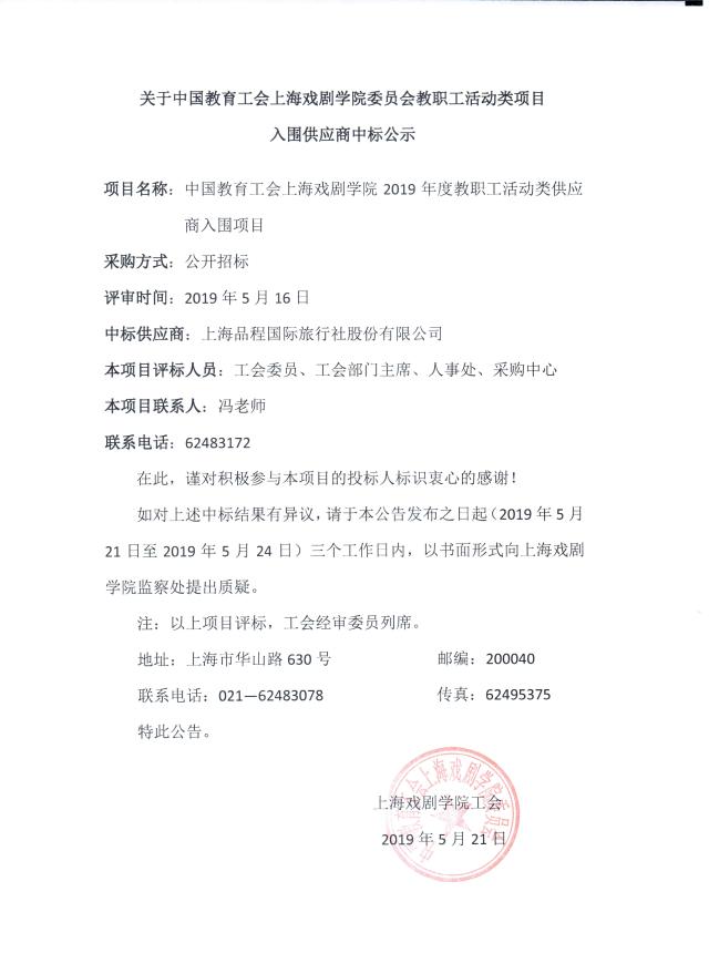 关于中国教育工会上海戏剧学院委员会教职工活动类项目入围供应商中标公示