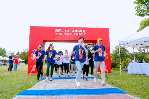 随后,校党委书记谢巍打响了发令枪,老师们分四批出发,开始健步走。在浦江郊野公园内沿指定路线进行五公里健步走。五公里的行程中,选手们须在沿途所设的四道关卡完成任务后方能继续行进。这些任务包括党史知识问答、红歌接唱等。既帮助选手们在比赛中适当调整节奏,又使大家进行了别开生面的党史知识的学习。