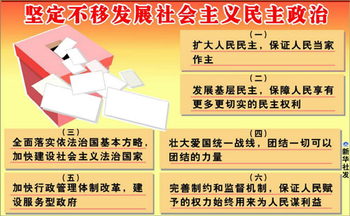 推进社会主义民主政治在以往的“制度化”、“规范化”的基础上,又增添了“程序化”的内容;扩大人民民主权利方面,增加了“表达权”的内容;将政治协商纳入决策程序;逐步实行城乡按相同人口比例选举人大代表;探索实行职能有机统一的大部门体制……在民主政治方面,十七大报告中让人眼前一亮的新举措有很多。