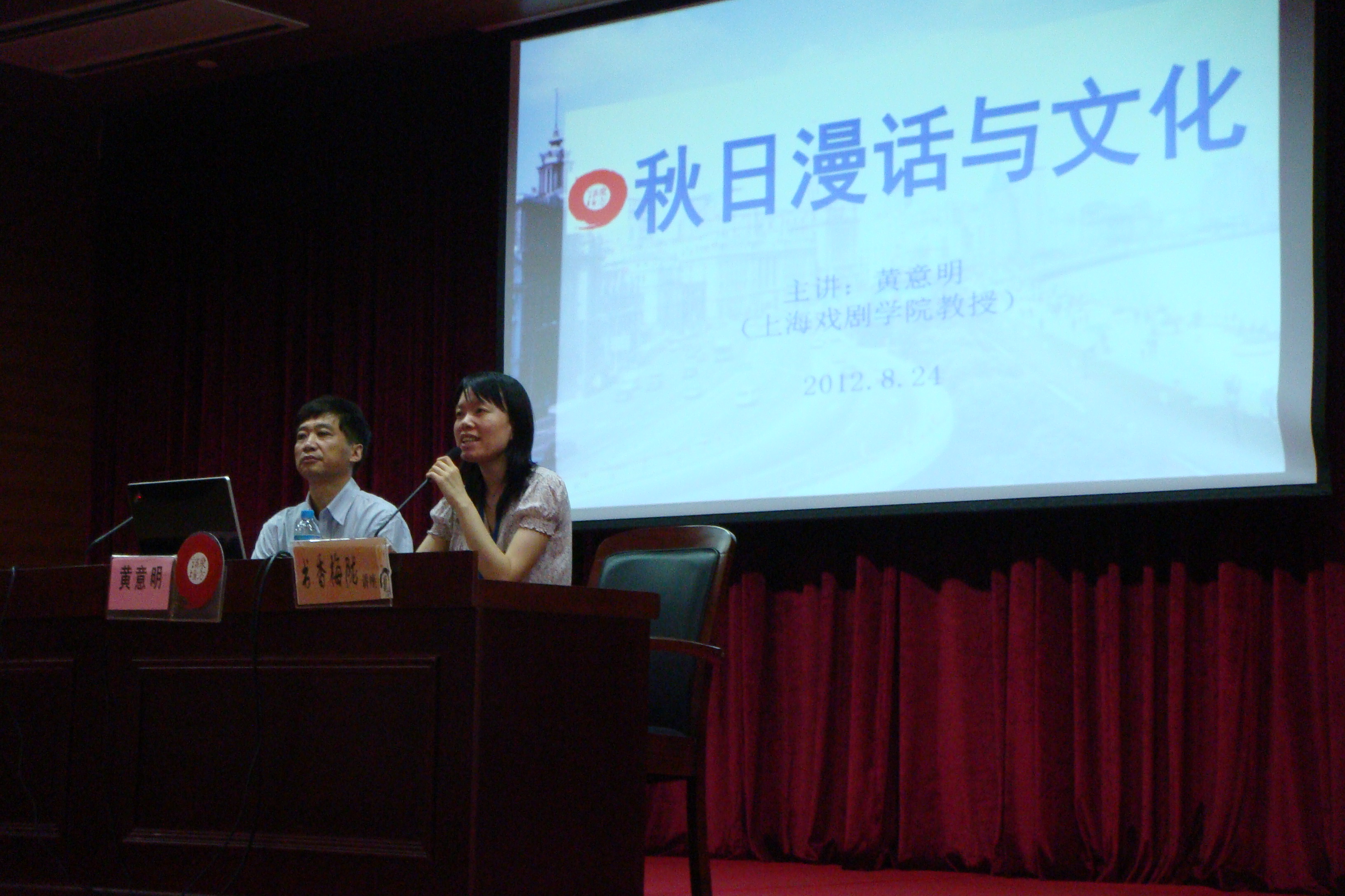 应“东方讲坛”之邀,我部黄意明老师在8月24日为闵行区梅陇社区居民作了“秋日漫话与文化”的讲座,这是普及高雅文化进社区的一个有益尝试。讲座受到了社区居民和干部的好评,会场气氛热烈。此前的5月10日,黄意明老师还应邀赴闵行颛桥社区为居民作了名为“孔子教你怎样做人”的讲座,讲座同样受到居民的欢迎。这说明,广大群众对高雅文化是有需求的,学者可以多做普及的工作。