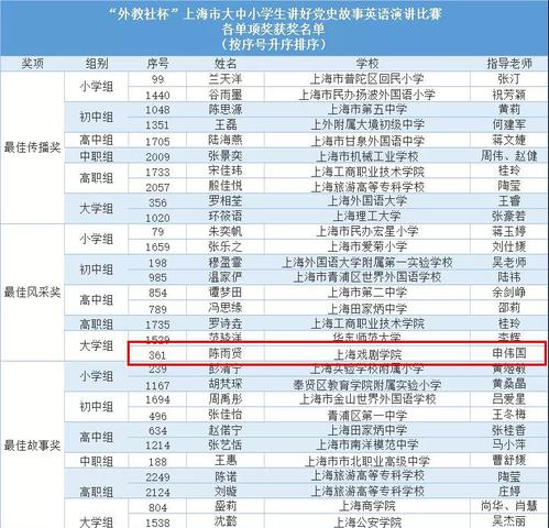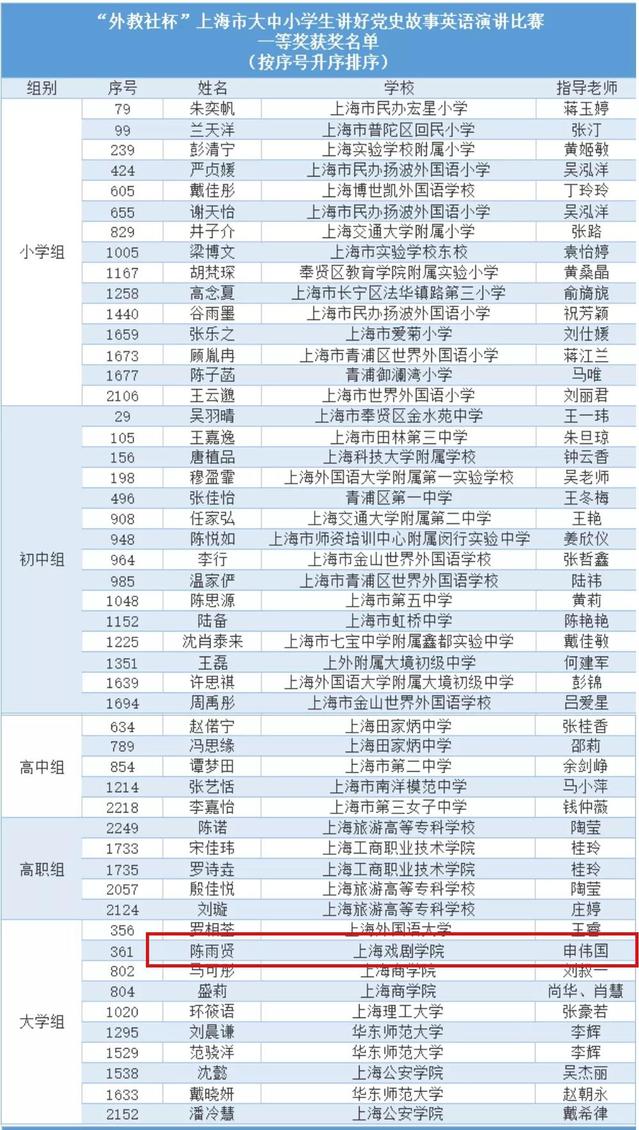 “外教社杯”上海市大中小学生讲好党史故事英语演讲比赛,自今年5月启动,分为小学、初中、高中、中职、高职、本科六个组别,共收到来自633所学校3616名学生提交的有效投稿。经评委会评审,在六个组别中共评出一等奖50个,二等奖159个,三等奖307个,最佳故事奖11个,最佳风采奖9个,最佳传播奖10个,优秀组织奖66个。