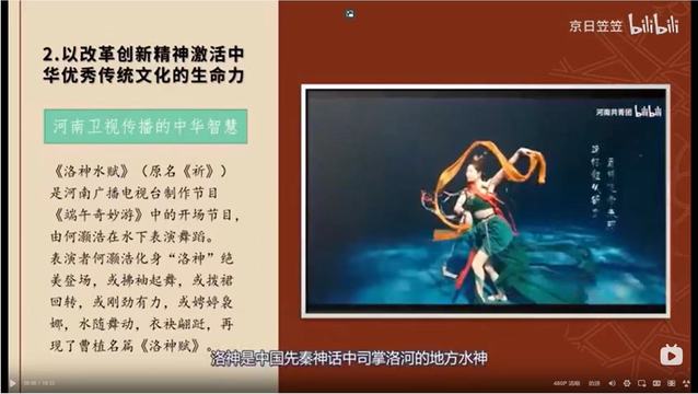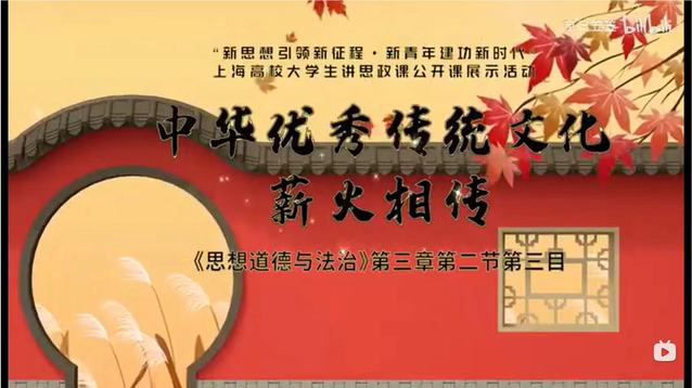 微课由施华东老师指导,曹嘉怡同学讲述,以图文并茂的形式,讲述了一名致力于讲好中国故事的大学生对中华文化代代相传的愿景与想法。作品通过诗词歌赋对《唐宫夜宴》、《洛神水赋》两场节目进行引用与描述,展现了对中华传统文化的创造性转化与创新性发展正面典型。以《三体》为例阐述了在国际文化交流中如何以“求同存异”方式传播中华文化,抒发了新时代大学生对传承好中华优秀传统文化的向往。