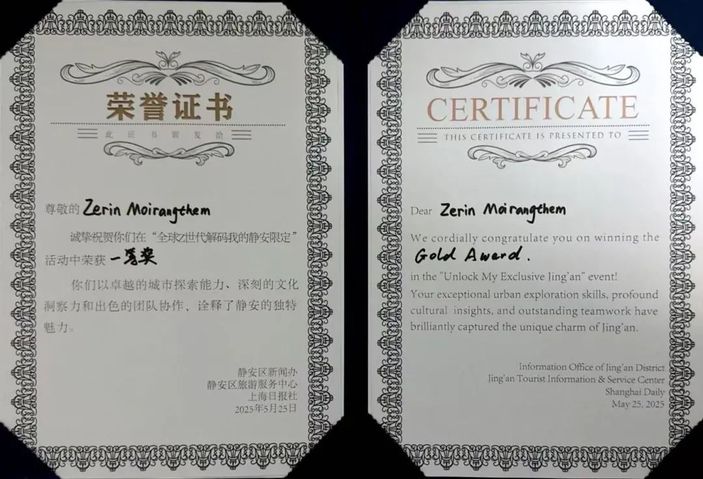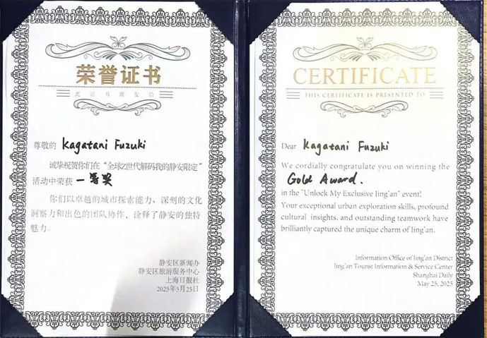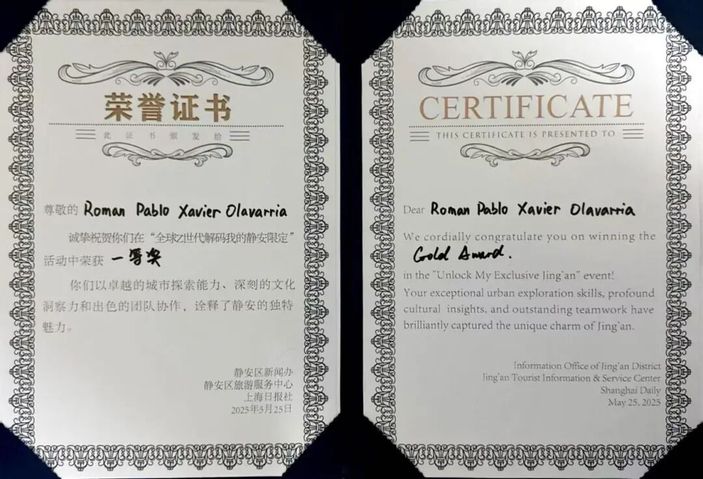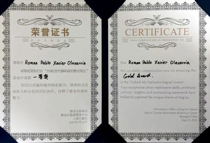 2025年5月25日,在由静安区新闻办、静安区旅游服务中心主办、上海日报社承办的“全球Z世代城市探索活动“Unlock My Exclusive Jing'an”中,来自开云足球首页官网下载国际学院的留学生团队凭借出色的文化洞察力与团队协作能力,力克上海交通大学和上海外国语大学两支队伍,荣获赛事一等奖。这支由五国学子组成的多元文化团队在静安多个文化地标留下了深刻的文化探索足迹,团队成员各司其职、紧密配合,最终交出了一份令人惊艳的答卷。