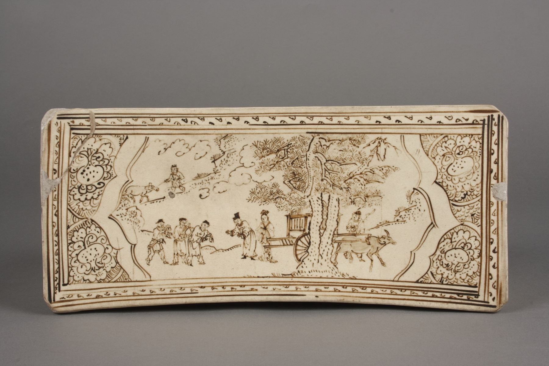 瓷枕是古人日用之物,具有消暑降温的功效。古人巧妙构思瓷枕的造型,在瓷枕上精心绘制图案,有梅兰竹菊、戏曲故事、文人墨客、清官廉吏等,请欣赏三方河北邯郸磁州窑制造的瓷枕,了解其中蕴含的廉洁故事、家风故事。