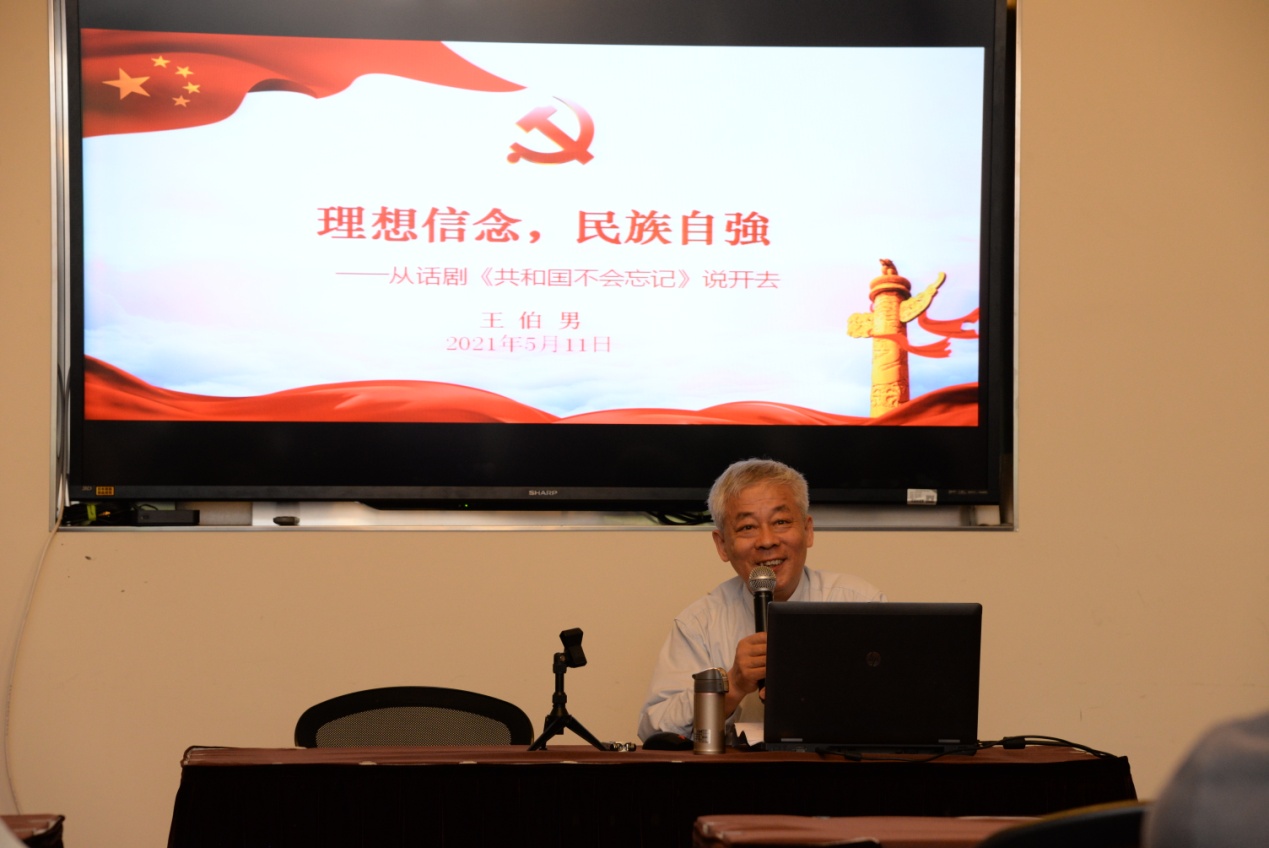 王伯男教授曾经创作了《共和国不会忘记》、《寻找师昌绪》、《甲午祭》、《东征》等话剧作品。他在创作过程中,查阅了大量的历史文献资料。党课上,他结合自身的创作经历向老党员们介绍了关于“两弹一星”科学家的名人轶事、介绍了从两次鸦片战争到中日甲午海战的历史背景和国情、介绍了中国共产党领导全国人民进行新民主主义革命的曲折历程。