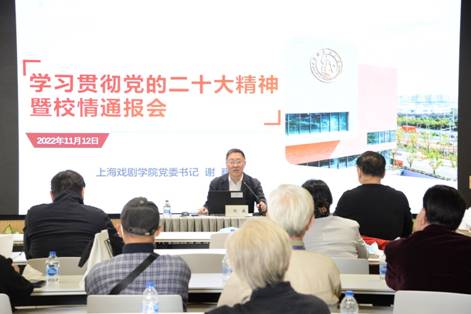 根据市委、市教卫工作党委的工作要求,11月12日上午,我校在华山路校区智慧教室召开专题会议,由学校党委书记谢巍同志向离退休老同志作学习贯彻党的二十大精神暨校情通报。因疫情受限,会议采取线下、线上相结合的方式,线下由离退休党总支委员、部分党支部委员、校老教协理事、老教授、校党风廉政督导、校教学督导、校教指委成员、校教学剧目评审组成员、校关工委与二级院系关工分会成员近60人出席会议;线上各支部在微信工作群中发送直播链接,请离退休党员同志在线收看学习。