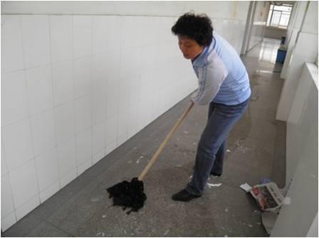 在教学楼,学生科副科长周徐红老师身先士卒,穿起工作服带领同学们一起劳动,各班班主任也积极参与,在教室中坐镇,指导学生开展活动。在领到自己的任务后,学生们将走廊上,厕所门口、教室里有划痕和污渍的墙面重新进行粉刷,用百洁布将桌面上的圆珠笔印统统刷洗干净。有的学生脱下长外套、卷起袖口蹲在地上铲除黏住的口香糖,有的学生站上桌子,清理高处的蜘蛛网。在这寒冷的冬日,同学们却干得热火朝天,额头上都渗出了汗水。在团员的带动之下,许多非团员的学生都纷纷加入进校园文明行的活动中来,将大家共同课的教室和楼道打扫一新。