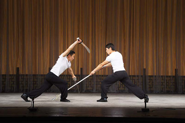 图为男生把子“双刀滚脖枪”表演者:李彦杰、邱君殿(上海戏剧学院附属戏曲学校)
