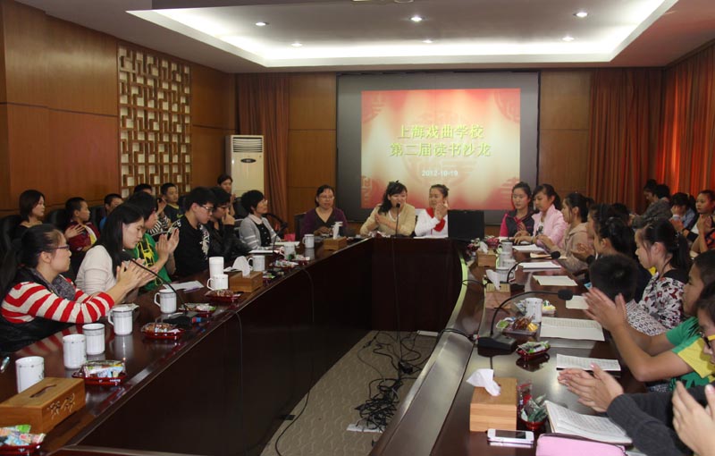 2012年10月19日下午,由戏校学生科组织的戏校第二届读书沙龙活动在图书馆四楼会议室举行,本次沙龙活动的参加范围得到了进一步扩大,更多热爱阅读、乐于分享的同学加入了戏校读书爱好者的队伍。本次沙龙活动邀请了我校学生科科长刘爱香、学生科吉莉、谢金宝,教导科副科长黄坚英、文教组副组长孙淑清、语文老师梦风雪、校办雷燕鸣、安树,以及各班班主任到场参加。由越剧班的赵一兰和王婉娜主持。
