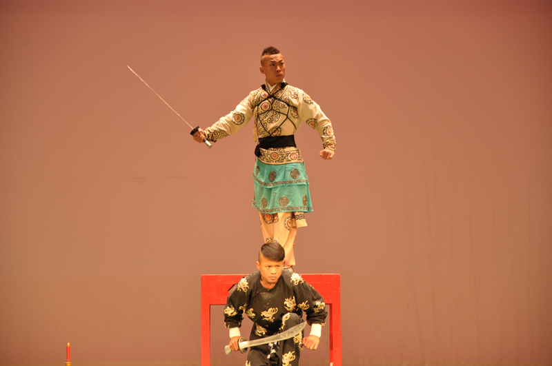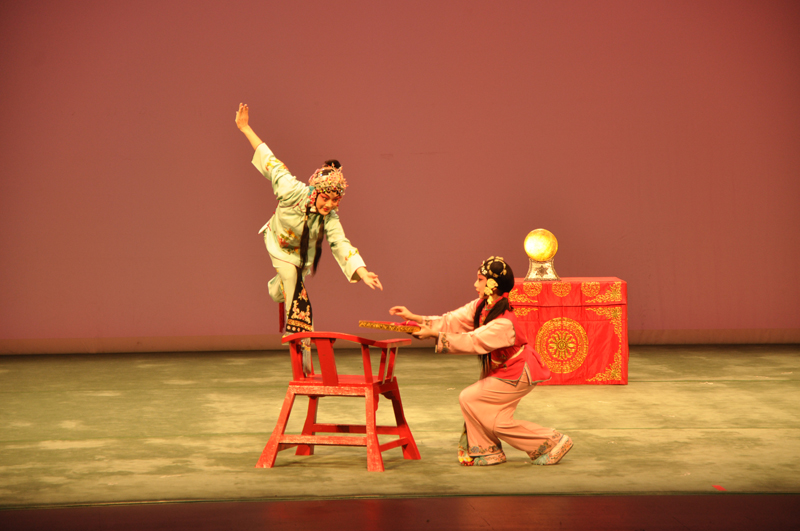 值得一提的是,这次展演不单单是由学生上台表演,更有诸多青年教师亲自出马,既教又演。《挡马》中扮演杨八姐的纪晓玲老师,对戏中“鹞子翻身”、“掏翎”、“踢腿”等动作表现得潇洒流畅,充分展现了杨八姐“女扮男装”的阳刚之美。《挂画》中潘洁华老师,既精悍又灵巧地展示了唱、念、做、舞,手、眼、身、法、步等花旦应有的功力,博得台下阵阵喝彩。《虹桥赠珠》扮演碧波仙子的赵博砚老师身手不凡,群打场面恢宏、满台生辉。她的“前后桥踢枪”、“腾空踢枪”、“乌龙绞柱踢枪”、“连续三次弹双枪”等高难度出手动作,干净利落、有惊无险,更是赢得了澳门观众的欢呼。