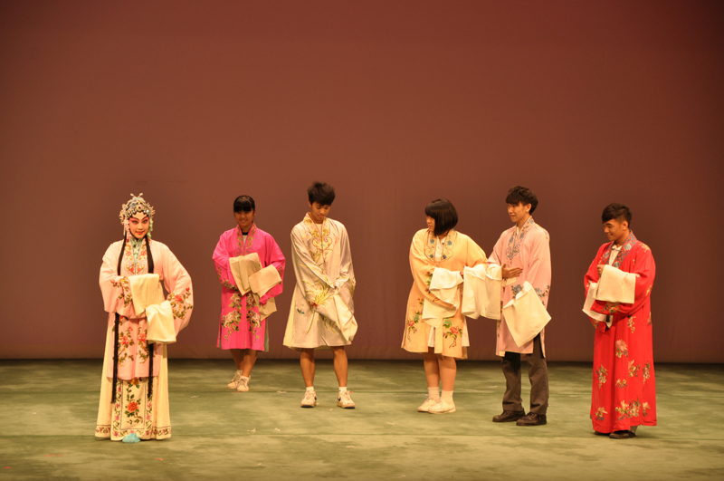 为了让澳门中学生充分观赏并了解中国戏曲艺术,我们在展演中穿插了双方主持人问答的环节,先后将中国戏曲的产生来源、戏曲的三大艺术特征、“生旦净丑”的角色行当、“四功五法”的表现技巧、戏曲乐队的基本构成等五大问题,予以解疑释惑。同时,为了激发兴趣,还设计了互动的环节:学生可以在演员的示范下,上台学习水袖表演,在演员们的示范下,澳门中学生代表们饶有兴趣地学习了“抖袖”、“翻袖”等水袖动作,他们有模有样的模仿,博得了台下同学们的掌声。