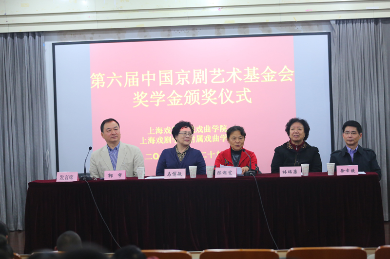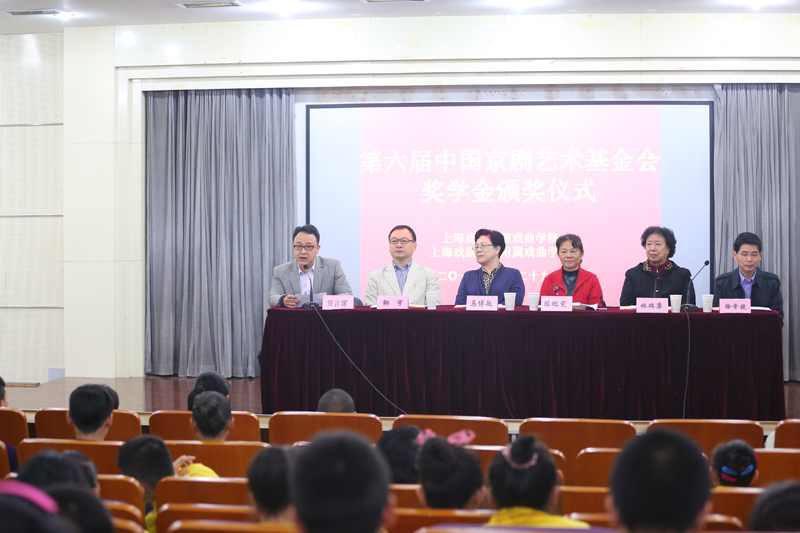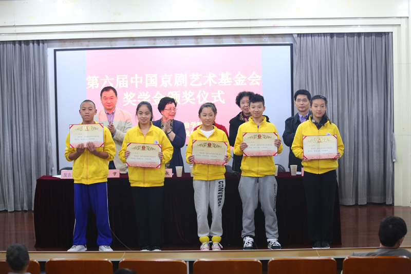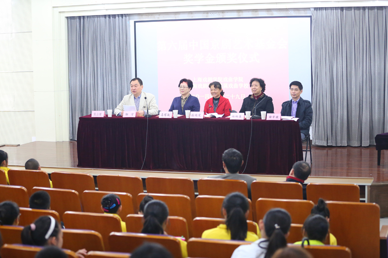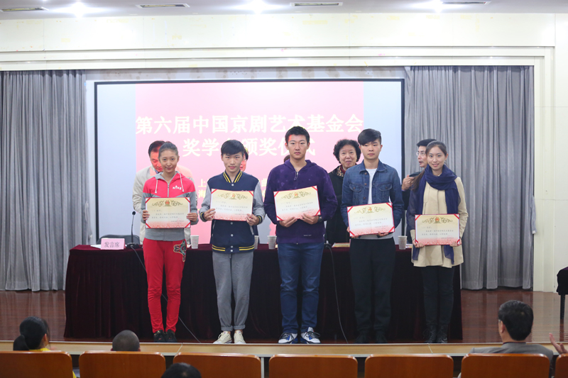 首先,郭校长介绍了出席本次颁奖仪式的领导以及中国京剧艺术基金会的概况。然后,基金会理事兼副秘书长徐幸捷宣读了本次获得“第六届中国京剧艺术基金会奖学金”学生名单(戏曲学院5名 戏曲学校5名)。随后,基金会领导和校领导向获奖学生颁发了证书并合影留念。