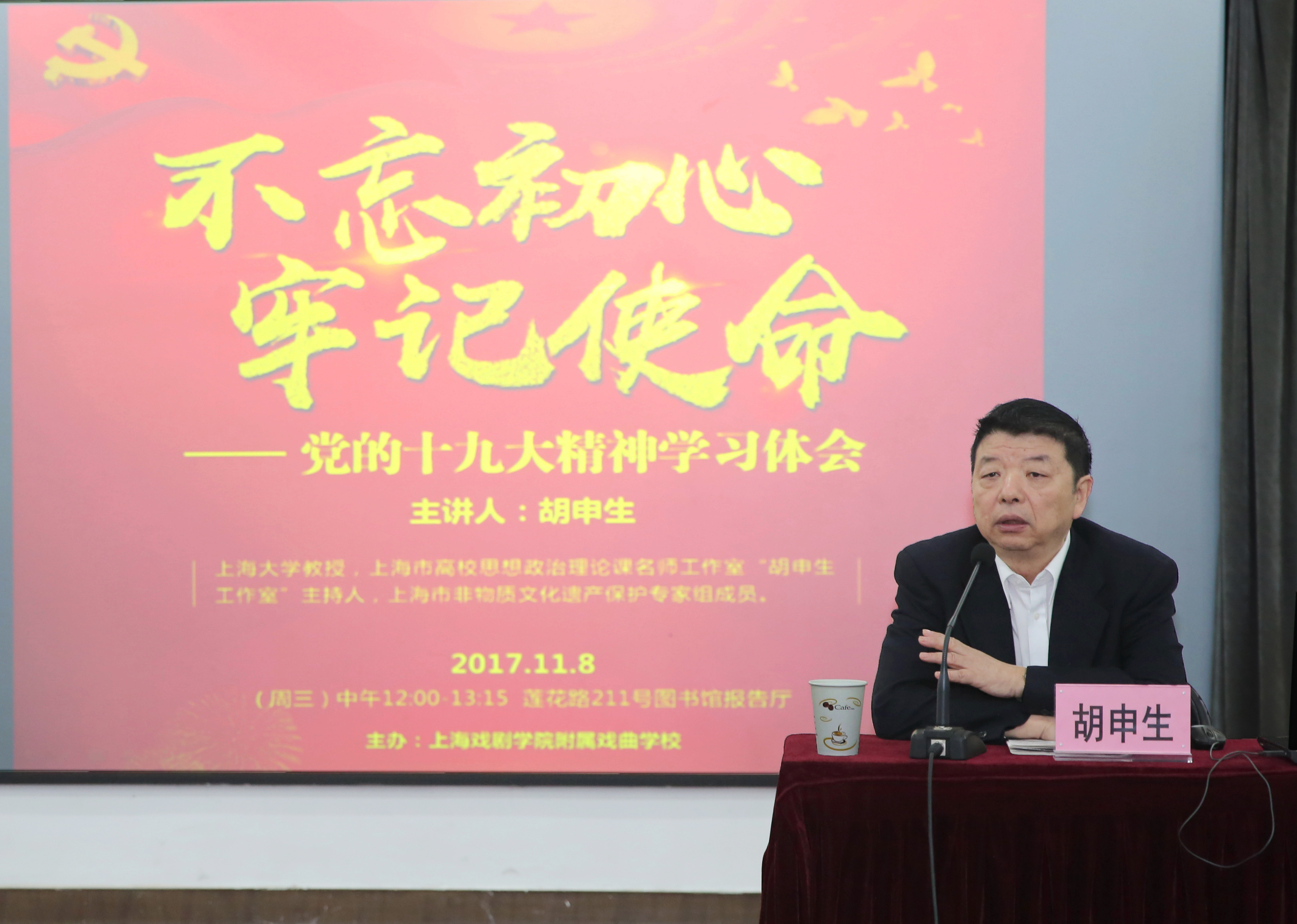 2017年11月8日中午在莲花路图书馆报告厅,戏校学校全体在职党员、积极分子、部分退休党员及戏曲学院、电视艺术学院党员济济一堂,共同聆听胡申生教授的“不忘初心、牢记使命——党的十九大精神学习体会”报告。胡教授是上海大学教授、上海市高校思想政治理论课“胡申生名师工作室”主持人、上海市非物质文化遗产保护专家组成员。