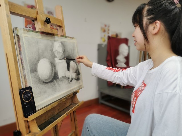 3、考生在试题公布当日按我校命题在指定试卷上完成绘画作品,并同步影像记录绘画过程。影像记录拍摄时,应从考生斜后方(如图)拍摄,保证考生与作品同时出现在视频画面中,考生面部侧面和作品完整清晰。同时视频画面中须全程出现可正常使用、时间显示清晰的钟表或计时设备。在规定的绘画时间内结束考试后,考生须手持作品转身面对镜头,此时拍摄考生正面(腰部以上)并保证考生五官与作品清晰。影像记录以光盘(或U盘)作为载体与考卷在规定时间内一起寄回。