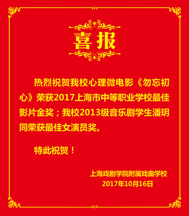 热烈祝贺我校心理微电影荣获2017上海市中等职业学校最佳影片金奖等