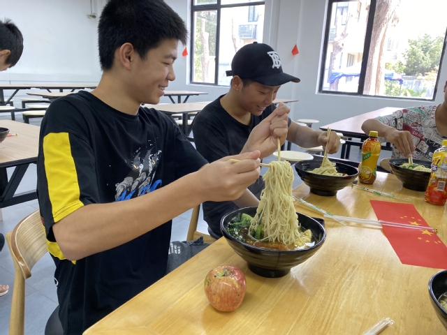10月2日中午,在刘爱香副书记和学生科老师的带领下,假期留校的同学相聚在食堂共同品尝了国庆喜面。刘爱香副书记为本次活动致词,与同学们一起庆祝新中国成立七十一周年。大家挥舞着国旗,品尝着喜面,心中满是感慨。此次品尝喜面活动让同学们深刻意识到了要做一个爱国的人,没有国,哪有家;没有家,哪有你我。在这个普天同庆的日子里,祝福祖国繁荣昌盛,不忘初心、牢记使命。少年强,则国强,要好好学习,为祖国争光。此次活动更让同学们感受到了学校带来的温暖,虽然没回家,但同学们感受到了家的温暖,也很感谢每一位默默为同学们付出的老师和校园的工作人员。