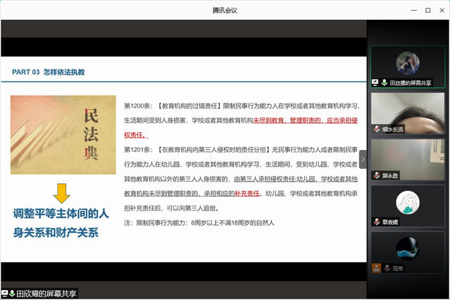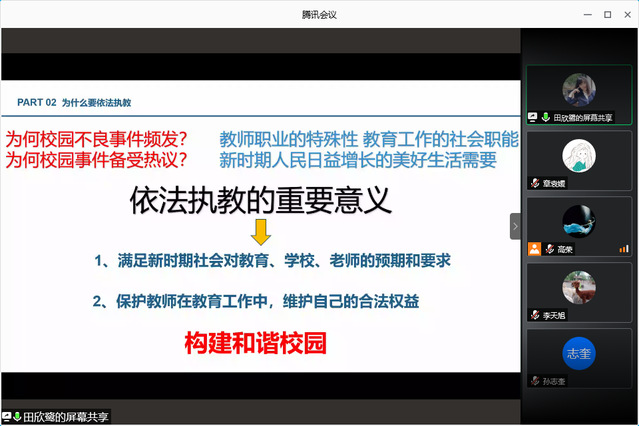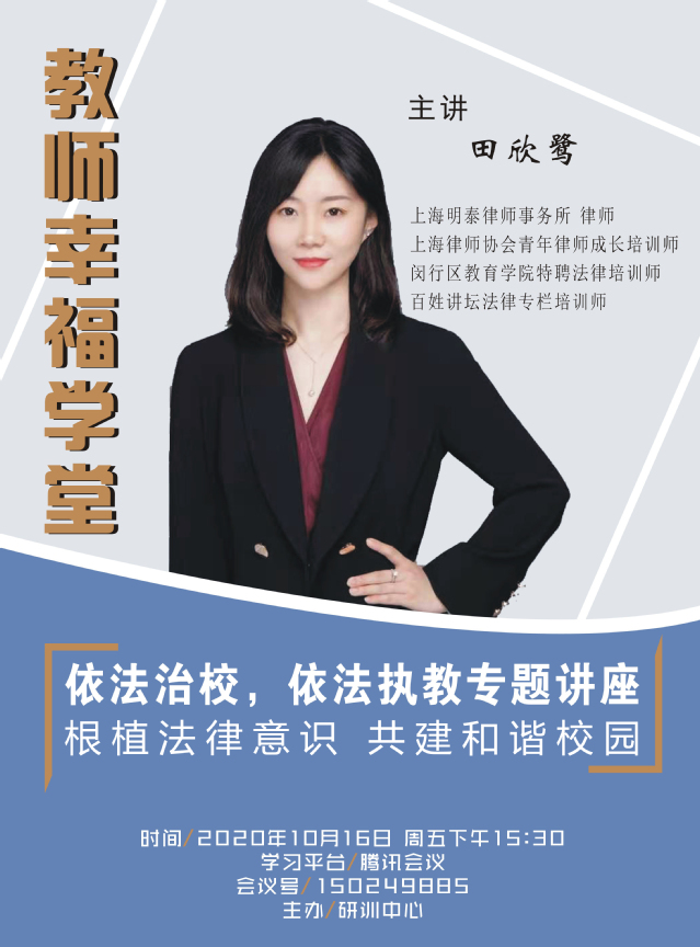 10月16日下午三点,一场特别的教师线上培训讲座通过云课堂启幕,由我校研训中心主办特邀明泰律师事务所田欣鹭律师,为全校教职工带来一场看似遥远实则与人息息相关的法制教育——《依法执教,构建和谐校园》。全校教师如约相聚,共享集学术性与实用性为一体的法律讲座。