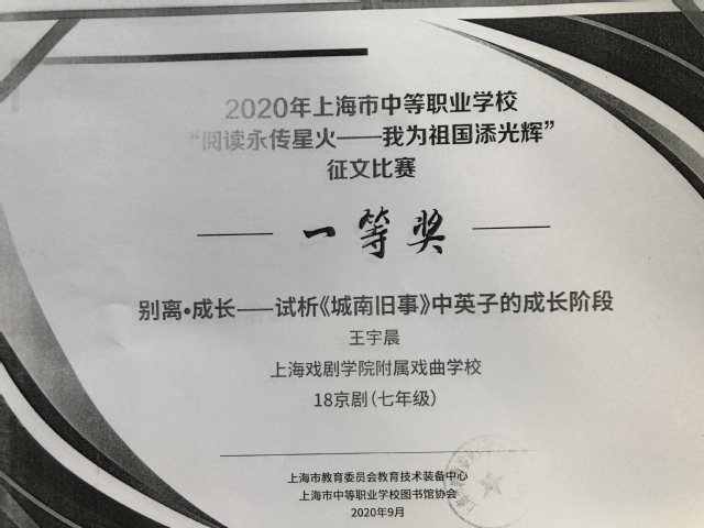 热烈祝贺我校学生王宇晨获得2020年上海市中等职业学校“阅读永传星火--我为祖国添光辉”征文比赛一等奖