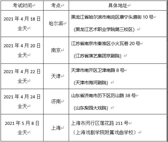 2021年开云足球首页官网下载附属戏曲学校表演(京剧)中本贯通专业将于4月18日-24日在全国四个校外考点进行专业初试,考试时间、地址详见下表: