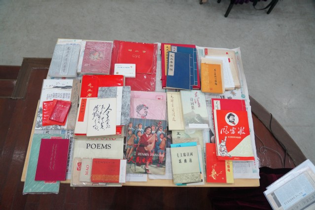 同时,江老师还向大家展陈了他精心收藏的部分版本《毛主席诗词》。其中有单行本、注释本、字帖本、图画本、歌曲本、手迹本、线装本、外文本等十六种,琳琅满目,蔚为大观。江老师并逐一作了简扼的介绍讲解,让大家深入了解其发行背景、装帧特点等。