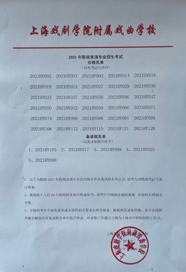 上海戏剧学院附属戏曲学校2021年影视表演专业招生考试合格名单