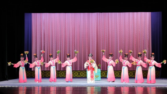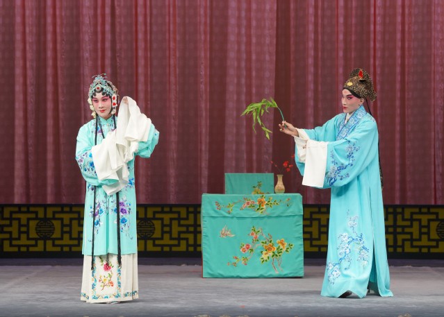 昆曲《游园惊梦》,由我校京剧教研室教师牟元笛饰杜丽娘、戴国良饰柳梦梅,陈韵竹饰杜母,戏曲学院学生陈申越饰春香,由北方昆曲剧院韩世昌亲传弟子林萍任艺术指导。牟元笛演绎的杜丽娘声情并茂、戴国良饰演的柳梦梅倜傥英俊,两人的“山桃红”表演桥段,极具细腻情感,深深感染在场观众。