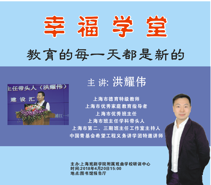 四月二十日下午,春风袅娜,天清气朗,由我校教师研训中心主办的“幸福学堂”之“教师成长系列讲坛”再次开课。为了加强班主任工作,更好地提升教师专业素养,改善教学过程中师生的沟通技巧,全面提高教师的教学能力与水平,有效推动“学生核心素养培育”的深层开展,特邀上海市德育特级教师、全国优秀教师、上海市劳动模、上海市教书育人楷模、闵行区浦江一中美术教师、班主任洪耀伟老师,为全体老师作《教育的每一天都是新的》的专题报告。