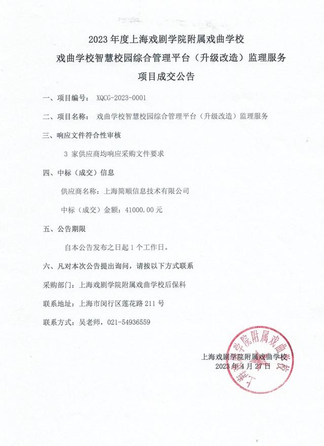 2023年戏曲学校智慧校园综合管理平台(升级改造)监理服务项目成交公告