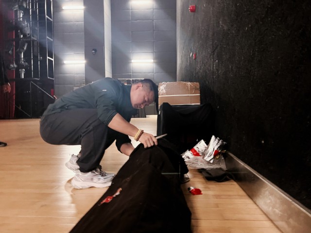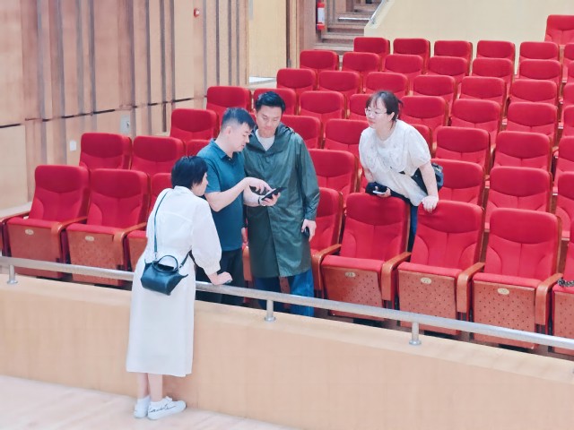 张军校长和乐队老师、舞美队老师一起现场调试各类设备,全面保障演出质量
