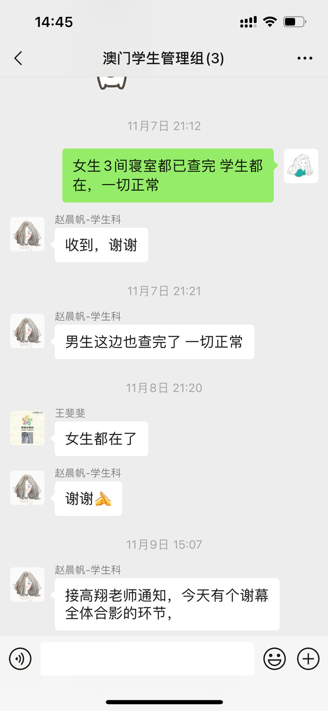 由于这次住宿地的管理要求,男女楼层严格区分,不可以跨楼层走动,负责学生管理条线的老师积极应对,每天通过微信群等方式查寝,确保学生安全