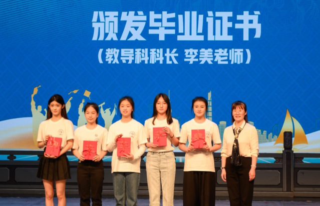 教导科科长李美老师为毕业生代表颁发了毕业证书。
