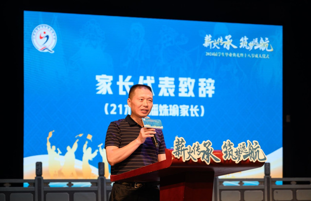 21木偶班潘姝瑜家长作为毕业生家长代表发言。他感谢老师们对全体学生的无私奉献,为同学们在学校期间的成长和取得的成绩感到骄傲。他代表家长们鼓励同学们未来能继续追随自己的爱好和理想,脚踏实地努力拼搏,取得更好的成绩,为社会做出贡献。