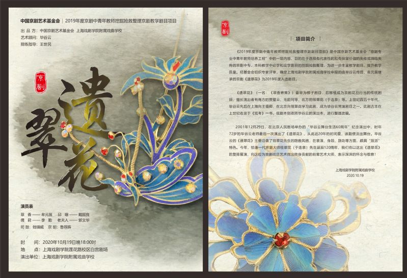 2020年10月19日晚18:00时,中国京剧艺术基金会2019年度京剧中青年教师挖掘抢救整理京剧教学剧目项目京剧《遗翠花》,在我校白宫剧场举行汇报展演验收工作。