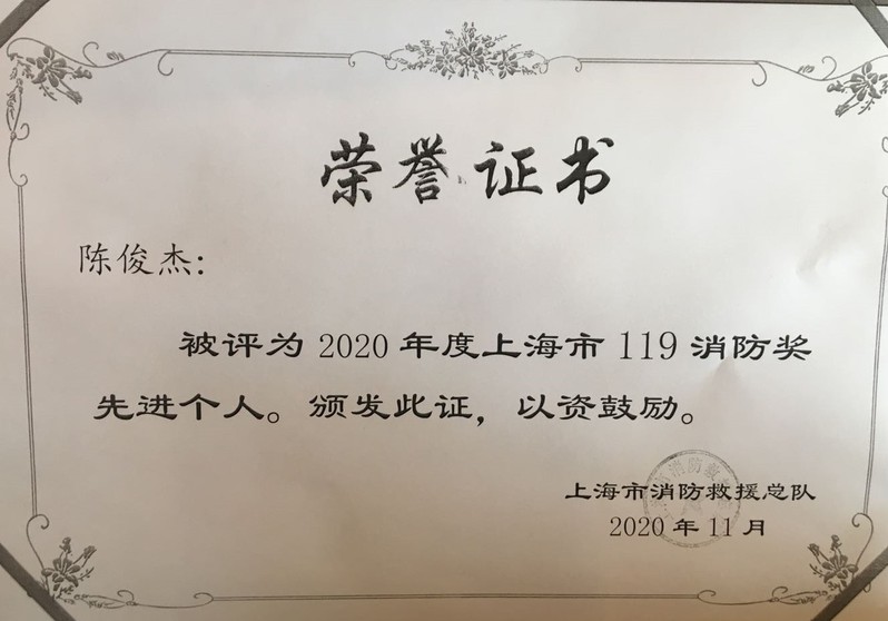 我校陈俊杰同志被评为2020年度上海市119消防奖先进个人
