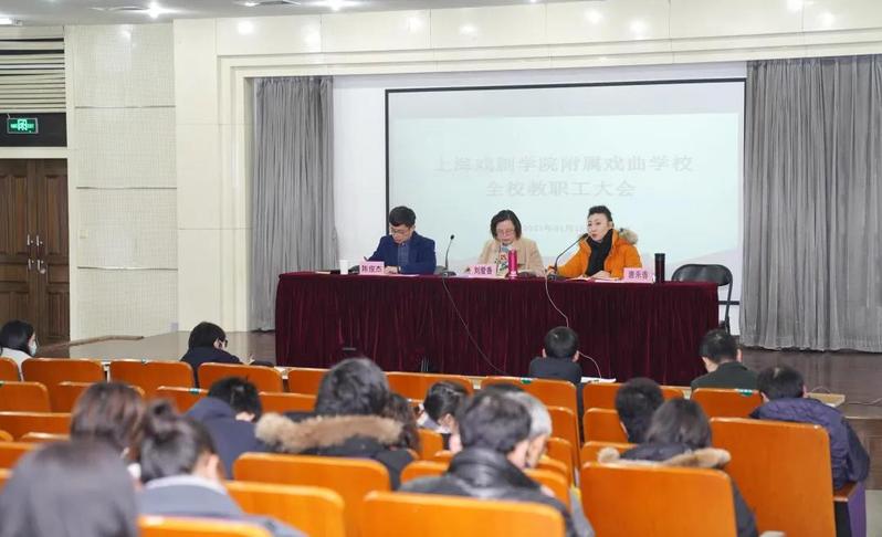 2021年1月15日上午,上海戏剧学院附属戏曲学校在图书馆一楼报告厅召开了全体教职工大会,会议由学校党总支副书记、副校长刘爱香主持,校领导班子成员、全体教职工出席了本次会议。
