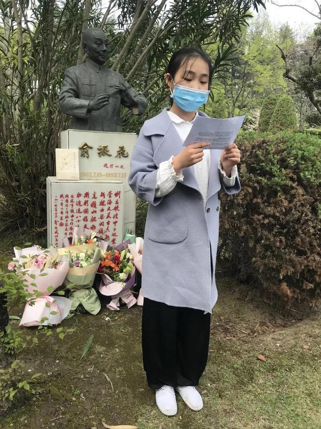 学生代表蔡乐艺、马千涵擦拭了俞老铜像和墓碑,最后,大家绕俞老墓地一周。