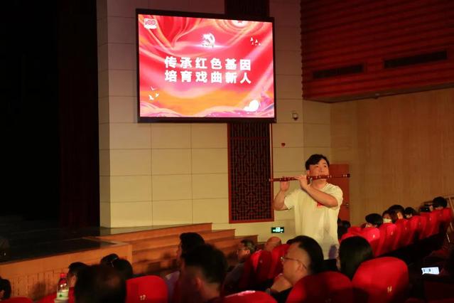 主题党日活动以“传承红色基因、培育戏曲新人”为主题,提炼出“传承”的关键词,通过15个不同形式的节目,将散落在不同历史片段中的单个音符,谱写成百年党史教育凝心聚力的艺术和弦。开场节目是由张军校长和昆班学生共同演绎的《长刀大弓》。昆曲两代传人的同台演出,证明了只有在党的呵护下,才有戏曲人站在舞台上生生不息的机会。节目中小提琴与昆曲的完美融合,向观众展示出面向未来乃是“传承”的题中应有之义,只有坚持守正创新,才能将传统接引到更广阔的天地。