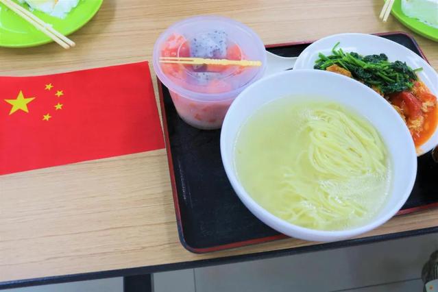 学校为学生们精心准备的国庆喜面,金黄酥脆的炸肉排、生脆爽口的青菜、色泽显眼的西红柿炒鸡蛋……一碗浇头十足、情谊满满的国庆喜面让大家吃出了浓浓的喜庆味道。