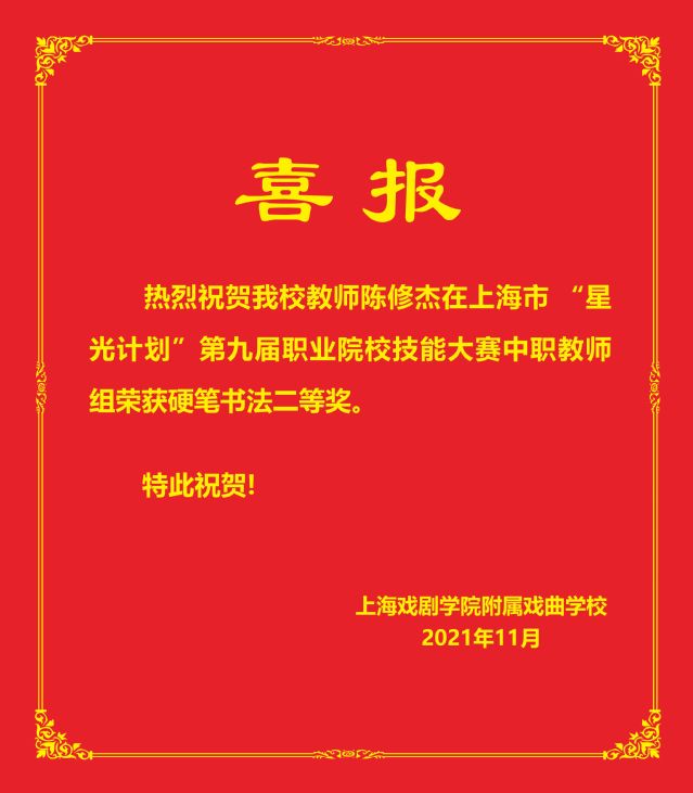 热烈祝贺我校教师在上海市“星光计划”第九届职业院校技能大赛中职教师组荣获硬笔书法二等奖