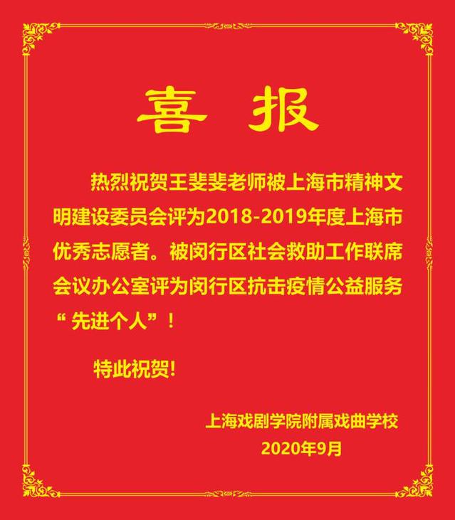 热烈祝贺王斐斐老师被评为2018-2019年度上海市优秀志愿者等荣誉称号