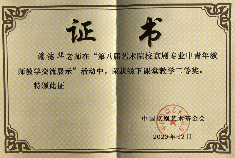 潘洁华老师获得“第八届艺术院校京剧中青年教师交流展示”(线下课堂交流展示项目)二等奖。