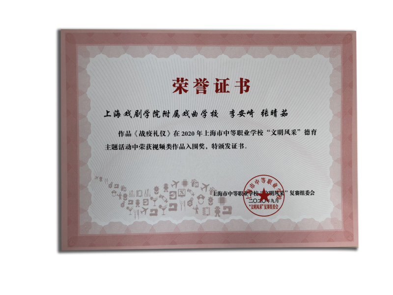 祝贺!我校学生李安崎等《战疫礼仪》2020年上海市中等职业学校“文明风采”德育主题活动优秀作品奖(指导教师:徐晓云)