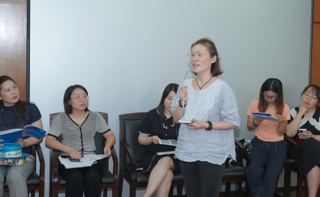在新进教师一一进行了简短的自我介绍后,音教组的刘怡菁老师作为入校三年的青年教师代表分享了入校以来的工作感悟,声情并茂的讲述了自己作为青年教师身上担当与责任。接着,市师资中心俞慧文主任受邀进行本次培训的开班致辞,她从教委对教师成长规培的整体规划出发,从教师的专业发展道路、教师的核心素养与能力、教师的基础思想境界三方面对新教师给予厚望,期望青年教师尊重教育的专业性、确立教育的信念、把教育作为终身信仰。