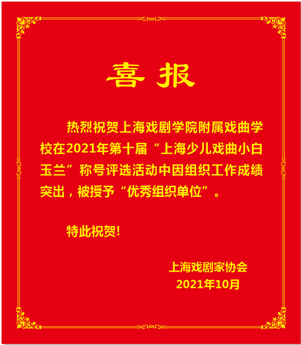 热烈祝贺我校在2021年第十届“上海少儿戏曲小白玉兰”称号评选活动中获得“优秀组织奖”