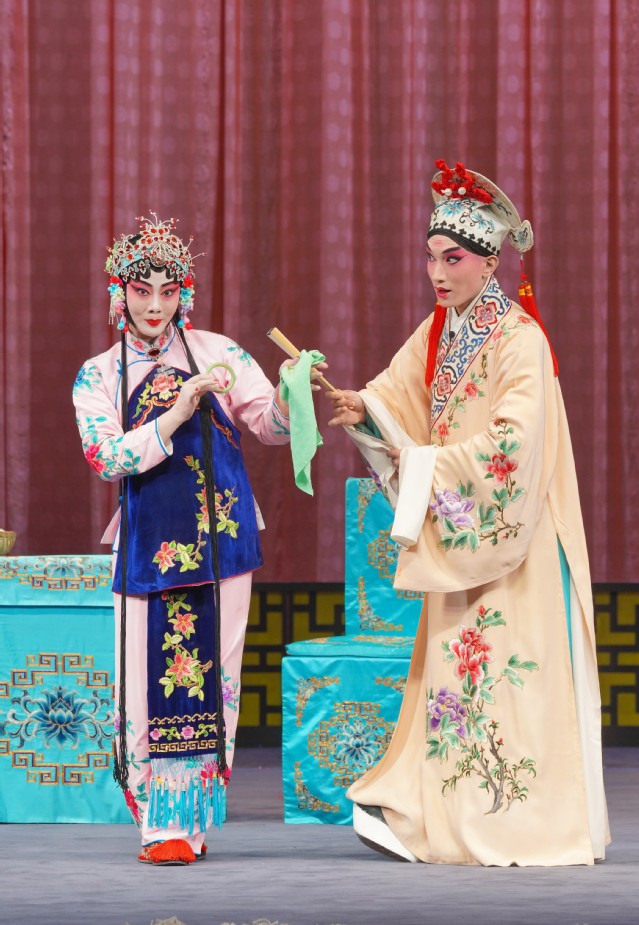 昆曲《游园惊梦》,由我校京剧教研室教师牟元笛饰杜丽娘、戴国良饰柳梦梅,陈韵竹饰杜母,戏曲学院学生陈申越饰春香,由北方昆曲剧院韩世昌亲传弟子林萍任艺术指导。牟元笛演绎的杜丽娘声情并茂、戴国良饰演的柳梦梅倜傥英俊,两人的“山桃红”表演桥段,极具细腻情感,深深感染在场观众。