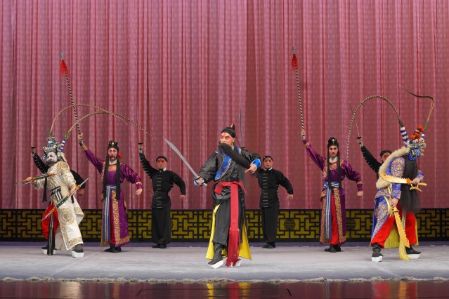 武生剧目《洗浮山》,由我校青年教师季永鑫饰贺天宝,盖叫天之孙、盖派艺术主要传承人张善元任艺术指导,该剧主要看武生演员综合表现,耍髯口、系大带、舞双刀,更兼具和同台演员武打把子技艺,以及翻转腾跃的武戏表演,使观众眼花缭乱、目不暇接,现场观众叫好四起掌声雷动,将最终的演出推向了高潮。
