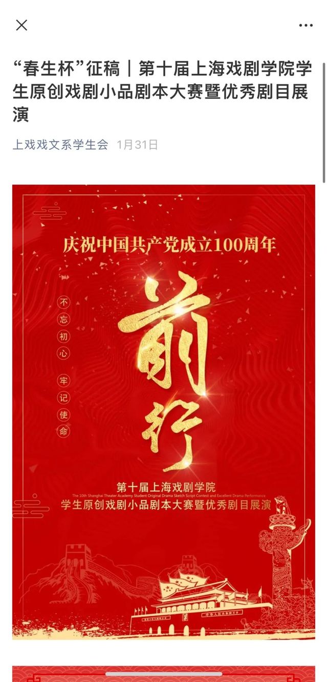 活动目标:云端投稿。戏文系学生会将举办第十届“春生杯”上海戏剧学院学生原创戏剧小品剧本大赛暨优秀剧目展演。本次大赛以“前行”为主题,鼓励学生自主编创并走入剧场,创作有思想、有内涵的优秀作品,庆祝中国共产党成立100周年。