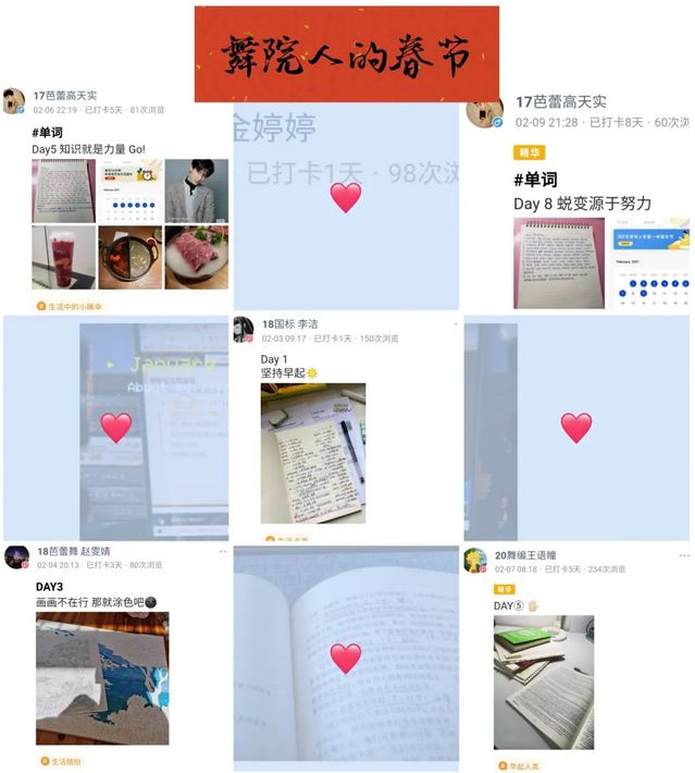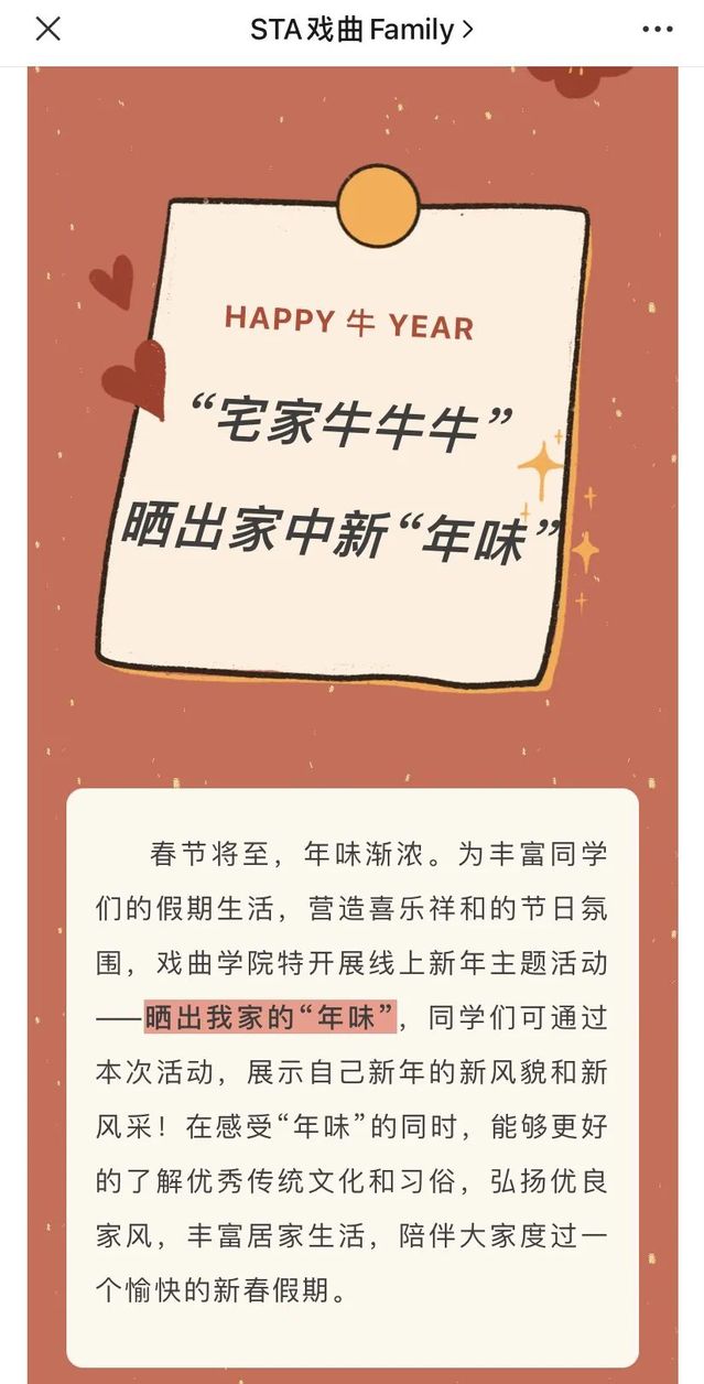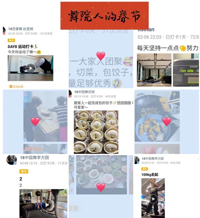 活动目标:春节“阳光宅”。围绕创作、学习、练功、春节、劳动五个主题,通过“小打卡”程序分享居家学习生活日常,并精选优质内容展示在新媒体平台,引领学风、传播正能量,陪伴学生度过一个健康、幸福的春节,并为参与啄壳计划、舞蹈剧目大赛做准备。