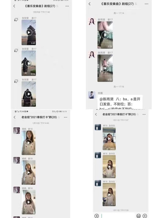 活动目标:假期中以班级为单位,督促表演系同学们积极开展云端学习打卡任务。每日在班级群或学习小组群里完成相应的学习任务并进行视频打卡,包括台词训练、身体训练、观察日记以及剧本阅读等。