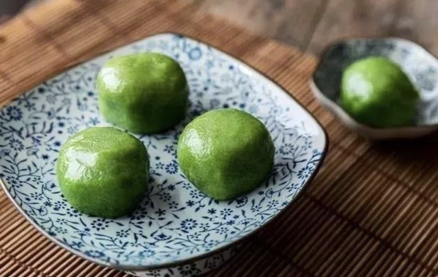 清明时节,在上海、浙江等江南一带有吃青团的习俗。人们通常在清明前后用艾草或一种名为“浆麦草”的野生植物的汁水,拌糯米粉制作成团子,再加入豆沙或莲蓉馅儿蒸制。有着淡淡的青草香气的青团就出锅了。